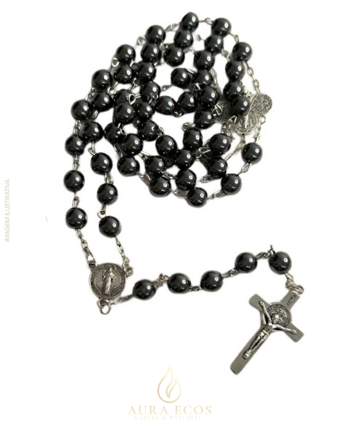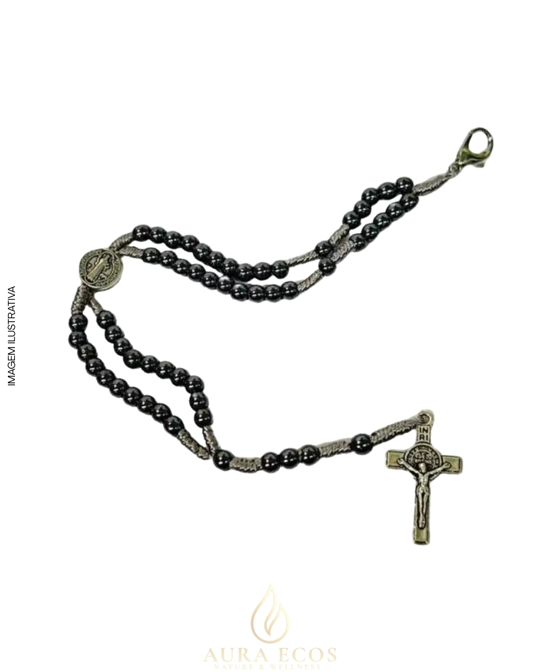 Terço de pulso em hematita com medalha de São Bento. Um acessório de fé, proteção e elegância para o dia a dia.